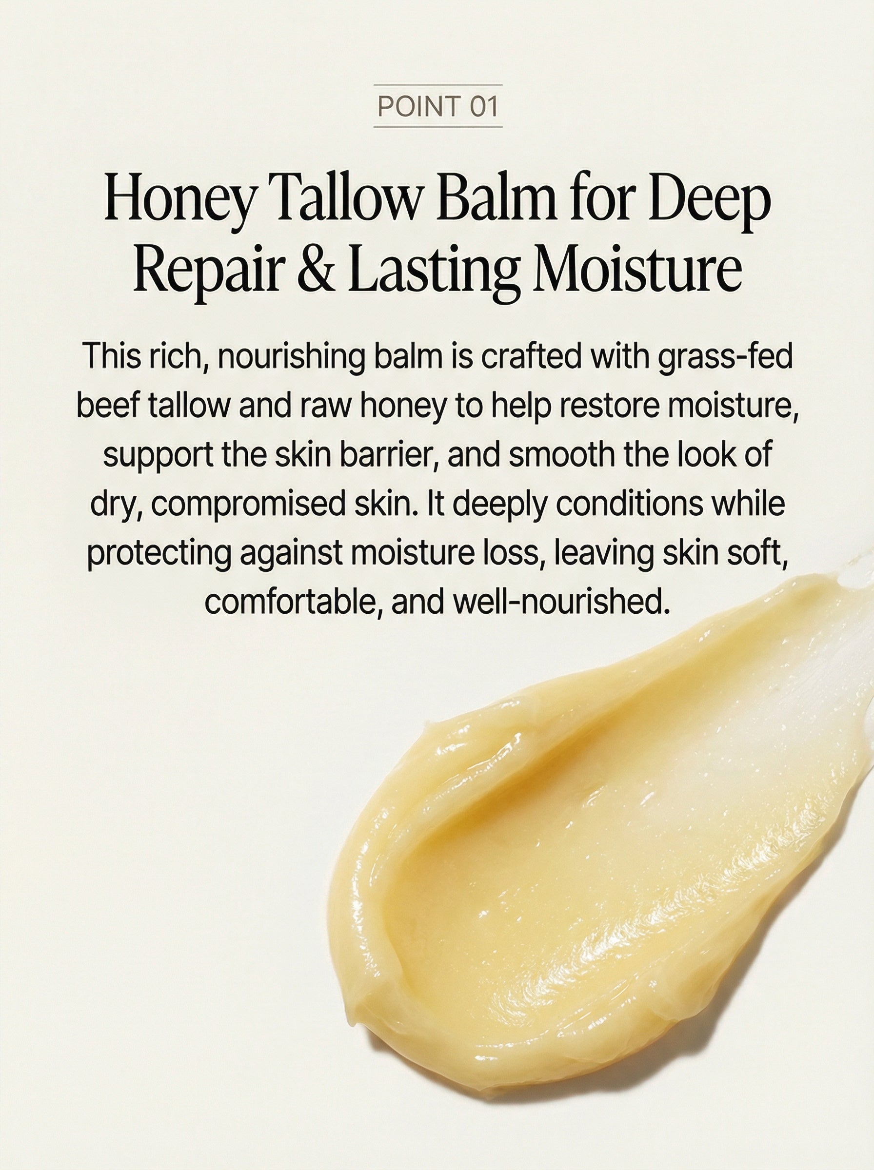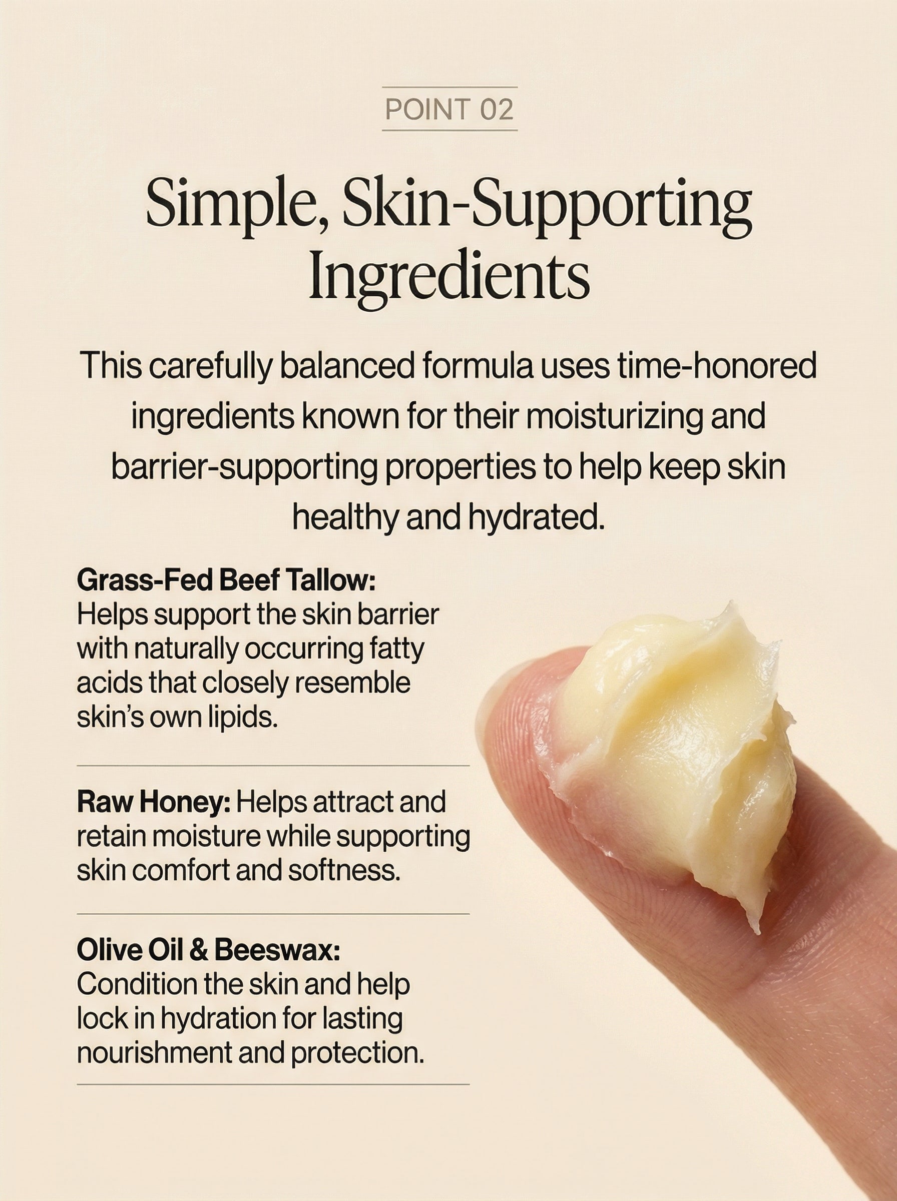 It delivers deep, long-lasting moisture using grass-fed beef tallow, raw honey, and natural oils to support the skin barrier, soften dry skin, and help skin feel smooth, comfortable, and nourished with each use.